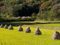いい夫婦の日の今日。 北風が強い一日でした。 急に寒くなって、ようやく里の森も色付いてきました。 田には、傘地蔵のように藁束が並んでいました。 彼らの視線の先には、赤く変わったウルシの葉と、まだ白い穂をつけるススキがありました。 (2003.11.22) |