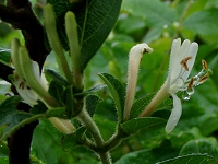 ゴールデンウイークになってから、天候がいまいちですが、どんよりと湿度が高いせいか、木々の花々の香りが里に漂っています。 良い香りがする方に歩んでいくと、それらの香りの発生源の花を見ることが出来ます。 フジの花は、2週間ほど前から良い香りを漂わせていましたが、このところ薮に咲く白いノイバラの花も目立つようになりました。 またこれら2種の花に負けじと、スイカズラも甘〜い香りをあたり一面に漂わせています。 これらの花々の香りの競演は、もう少し続きそうです。 (2004.5.4) |