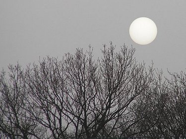 今年の春は記録的な量の黄砂が日本に届いたそうですが、確かに空を見るとぼんやりかすんでいることが多かったですね。 海辺で沖を見ると、海の上に黄色い大気の層が見られたこともありました。 左の写真はある日の夕暮れ。 娘が外から帰ってきて「空に何か変な白いものが浮かんでる。何か、まん丸なんだけど…。」と思わせぶりなことを言います。 未確認飛行物体?を確認しようと庭に出てみると、そこには真っ白な太陽が浮かんでいました。 (2006.4.8) |