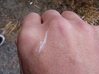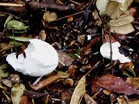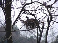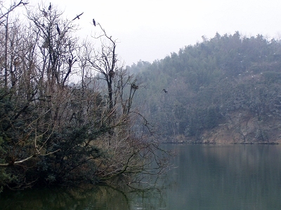 | 美浜町のカワウは、菅刈池にもコロニーをつくっています。先日、自宅から歩いて見に行ってきました。鵜の池で見るよりも間近に見ることが出来て、いろいろな新しい経験ができました。 彼らの巣の下は、尿(糞ではなくて、尿酸を含んでいて白い)のせいで真っ白くなっています。近寄ってみると魚をエサにしているだけあって、魚くさい(生臭い)においがしていました。 写真を撮ってから、その場を離れるとすぐに近くで”バシャ!”っという音が…。 ”あぁ、オシッコかけられないでよかった〜。”と思いながら、観察を続けました。すると、ふ化した後と思われる卵の殻を発見!…およそ3cmぐらいの大きさでした。 しばらくボーっと彼らの動きを見てからの帰り道。先ほどの尿が降ってくる場所を通らねばなりません。心配しながら駆け抜けると、またしても”バシャ!”っという音が…。”ジャストミ〜ト!”…いろんなところが白くなりました。 これからは、カワウの観察にはビニール傘でも持って行こうと思います。 (2004.2.29) |