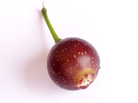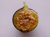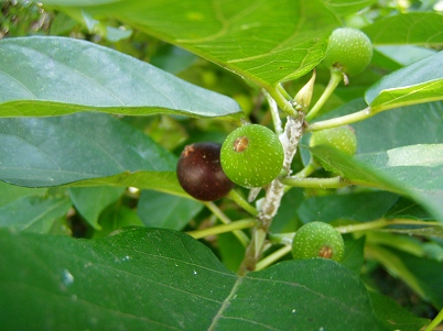 イヌビワの木に熟した実がなっています。ビワとは名ばかりで、イチジクのなかまの木で、葉や枝などを傷つけると、イチジク同様に白い汁(乳)が出ます。 ただ、作物のイチジクとは違って、イヌビワは、1oほどの小さなイヌビワコバチというハチが、花のう(実のように見えるかたまり)の中に入って、逃げられなくなって歩きまわり、受粉させないと実ができないとのこと…。 したがって、実ができて熟した花のうには、その花のうに受粉させ、逃げられなくなったイヌビワコバチの遺骸が入っていることになります。 以前からその味が気になっていた1.5p程度の大きさのイヌビワの実ですが、勇気を出して食してみると…。 ほんのり甘い、小さなイチジクっていう感じでした。(まったく虫は感じません。) また、かみさんに「ほらこれ食べてみ〜。」と食べさせてから、イヌビワコバチのことを話したら、とっても嫌な顔をされました。 (2004.8.1) | |