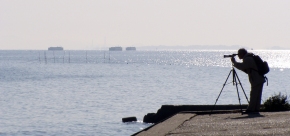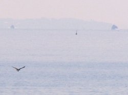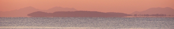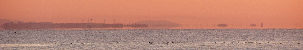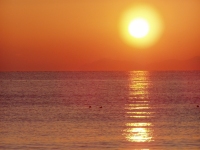 このところの朝、出勤していく頃に、ちょうど朝日が昇ってきます。その光景を写真に収めようと、ひさびさに休日の朝早く起きました。 外を見れば、よく晴れています。まずは、布土駅横の跨線橋から眺めようと思いましたがどうも電線が気になる。 上村の浜まで行ってしまおうと、歩いていくと左のような朝日が。 「きれいだなー。」と視線を先に延ばせば、何と対岸の三河一色のあたりが浮いているではありませんか。 以前にも、蜃気楼をとりあげましたが、私が美浜で三河湾側に、はじめて見た蜃気楼でした。早起きは三文どころじゃないトクでした。 (2004.1.25) |