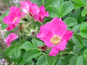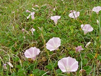 私が小学校低学年だったころ、学校の国語の授業で『ハマヒルガオの海』という読み物を習った記憶があります。定かな記憶ではありませんが、たしかこんな感じだったような気がします。 磯にできた潮だまりに小魚がとり残されていて、その傍らにハマヒルガオが咲いている。その潮だまりが”ハマヒルガオの海”。 焼け付くような強い日差しに照らされて、ハマヒルガオの海はどんどん小さくなっていく。小魚もハマヒルガオも弱っていきますが、お互い励ましあいます。 いよいよダメかという頃に潮が満ちてきて助かるのですが、そこには友情が芽生えた小魚とハマヒルガオに別れの時がやってくる。 子供の頃、そんなハマヒルガオの話に出会ってから、何となく物悲しいハマヒルガオの花を一度見てみたいと思って、夏に海に出かけるたびにさがしていましたが、出会うことができないでいました。 それが何とこの前の土曜日、冨具崎の浜にたくさん咲いているではありませんか! よくよく調べてみると、ハマヒルガオの花期は5月〜6月。 どおりで夏の最中にいくらさがしても、出会えなかったわけです。 …あの『ハマヒルガオの海』は、この時期の話だったんだ…。 (2004.5.22) |