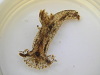 今年「うみうしくらぶ」という会に入会しました。(これは(財)水産無脊椎動物研究所が主催するものです。)この夏、その会が高知大学の臨海実習所で催した「磯の勉強会」に参加し、ウミウシ好きのみなさんに圧倒されてきました。 そんなこともあり、今まで以上に興味・関心が高まっていたのですが、友人家族達と荒磯松で磯遊びをしたところ、友人があの名著「へんないきもの」で紹介されているメリベウミウシを発見!大口を開けて這う姿は何ともユーモラスでした。